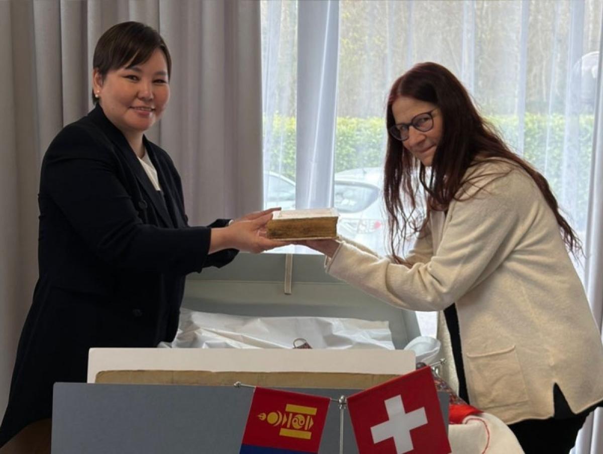 Швейцарын Холбооны Улсын Бернийн их сургуулийн номын санд хадгалагдаж байсан Монголын түүх, соёлын үнэт өвд хамаарах хоёр ховор бичвэрийг Монгол Улсад буцаан шилжүүлэх ёслол Монгол Улсаас Швейцарын Холбооны Улсад суугаа Элчин сайдын яаманд боллоо.