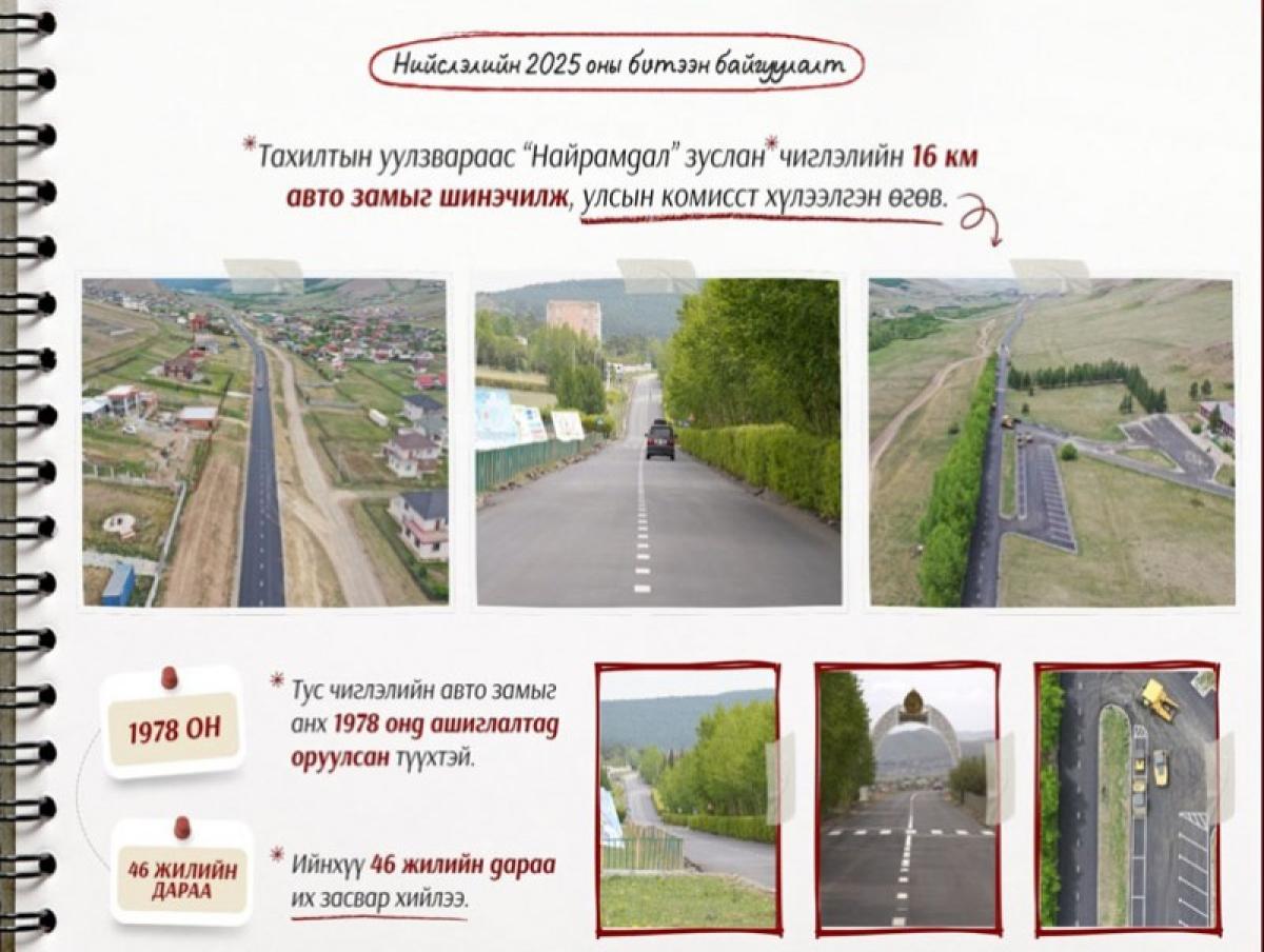 Харин энэ онд үлдсэн 12 км авто замыг шинэчилж, гэрэлтүүлэг, явган замын ажлыг дуусган улсын комисст хүлээлгэн өгөөд байна. Тахилтын уулзвараас “Найрамдал” зуслан чиглэлийн авто замыг анх 1978 онд ашиглалтад оруулсан бөгөөд 46 жилийн дараа их засвар хийлээ.