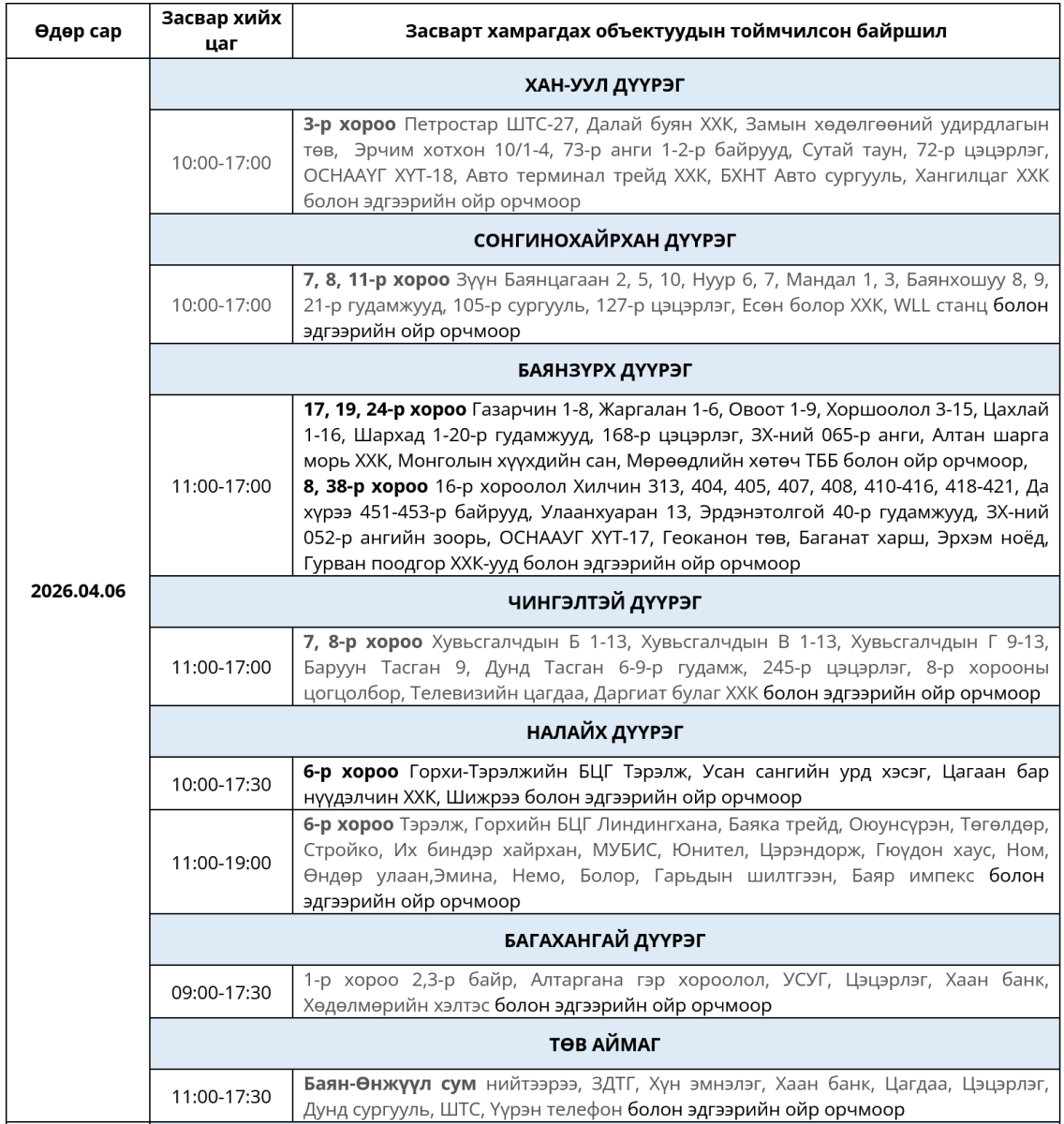 Өнөөдөр буюу 2026 оны дөрөвдүгээр сарын 6-ны Даваа гарагт цахилгаан шугам сүлжээнд хийх засварын хуваарийг танилцуулж байна.