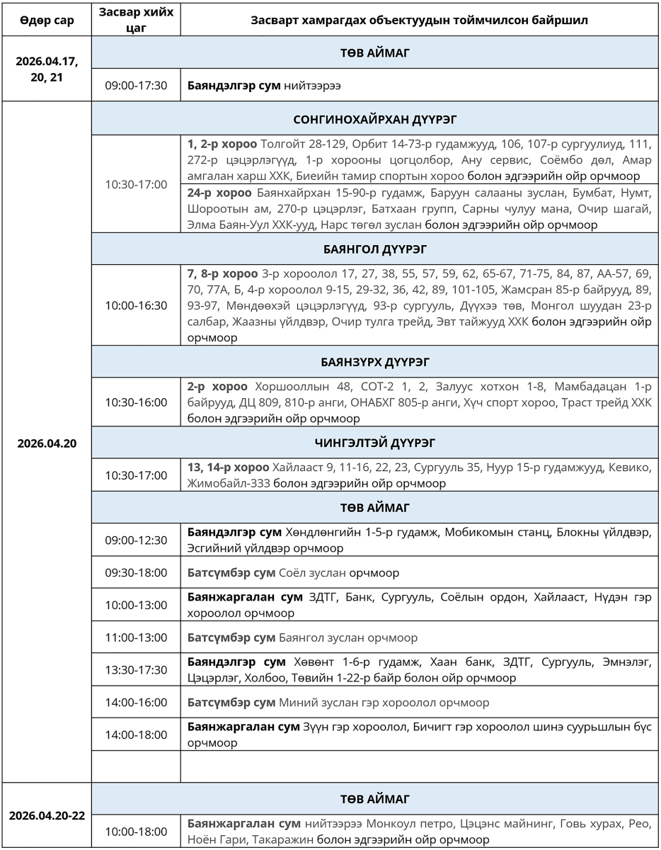 Өнөөдөр буюу 2026 оны дөрөвдүгээр сарын 20-ны Даваа гарагт цахилгаан шугам сүлжээнд хийх засварын хуваарийг танилцуулж байна.