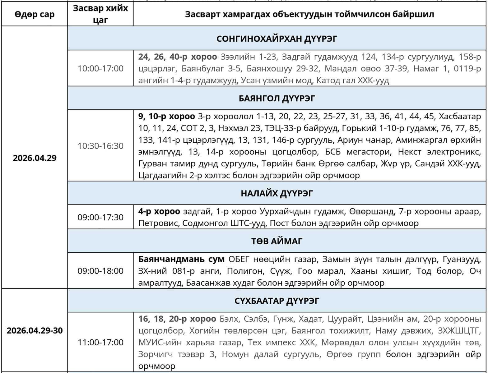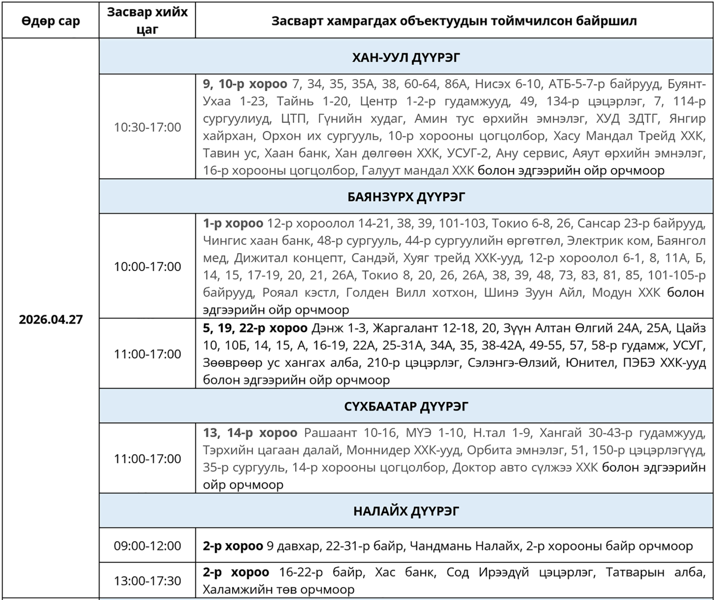 Энэ долоо хоногт буюу 2026 оны дөрөвдүгээр сарын 27-ноос 30-ны дуустал нийслэлийн цахилгаан шугам сүлжээнд хийх засварын хуваарийг танилцуулж байна.
